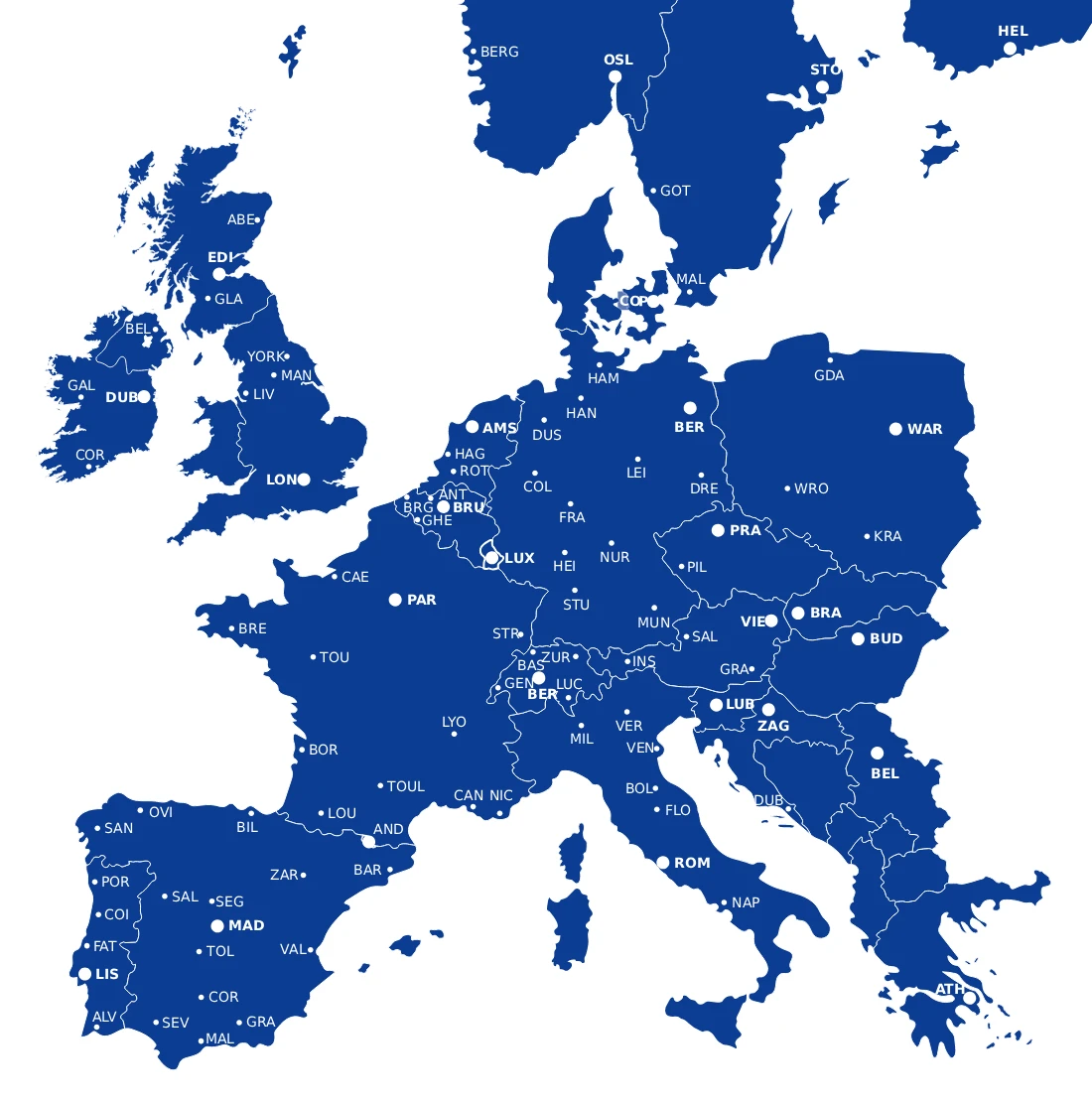 Paris, Bordeaux, Nice, Cannes, Strasbourg, Mulhouse, Tours, Dijon, Lyon, Toulouse, Brest, Caen, Lourdes, Aix en Provence, Avignon, Marseille, Montpellier, Rouen, Saint Malo.